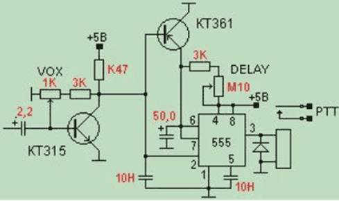 Для управления передачей рации (PTT) можно использовать голосовую активацию (VOX) – в этом случае, при появлении сигнала на микрофонном входе рация автоматически включается на передачу. В случае, если рация не имеет такой встроенной функции, можно воспользоваться несложной схемой ключа (например, простая схема радиолюбителя Николая, RZ4HX - см. рисунок ).