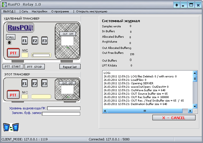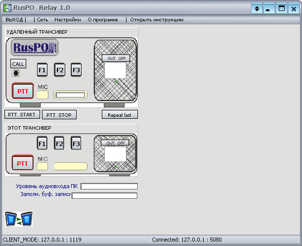 Кнопки <F1-F3> - следует нажимать, если рация подключена к LPT порту и требуется управление какими-то кнопками рации. Соответствующая опция должна быть включена в настройках. Если управляющий сигнал достиг удаленного ПК, значок "=" появляется над соответствующей кнопкой.