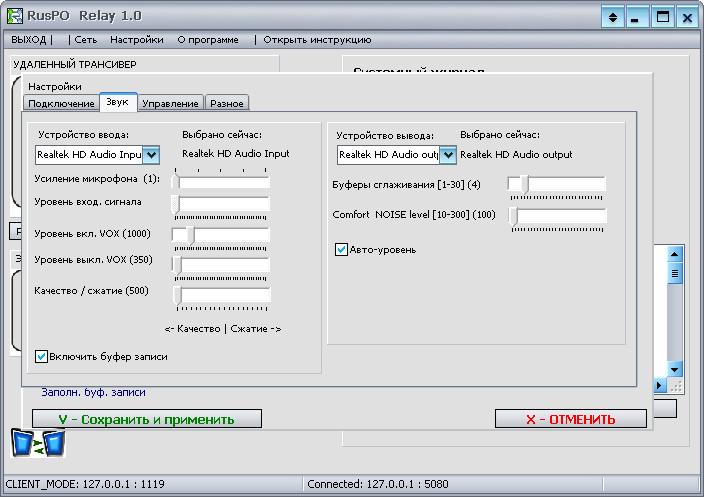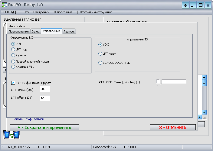 Чтобы определить, что в динамике рации появился какой-то звук, который нужно передать по сети, в программе есть встроенный ключ VOX. Для получения сигнала RX от рации можно также применить порт LPT (при появлении сигнала RX замыкать через ключ вход 11 на землю), а при необходимости, использовать аналогичным образом правую кнопку мыши или ключ, замыкающий клавишу F11 на клавиатуре.