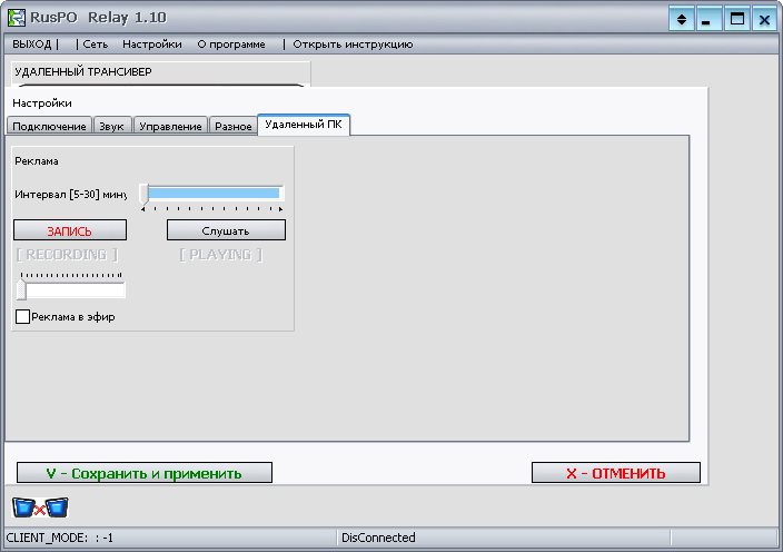 Кнопка <PTT> запускает трансляцию звука в сеть с локального компьютера на удаленный, даже если сигнал на входе аудиосистемы отсутствует или тихий. Кроме того, на удаленном компьютере принудительно включается режим "TX". <PTT> следует нажимать и удерживать левой кнопкой мыши. Пока кнопка нажата, идет трансляция в сеть.